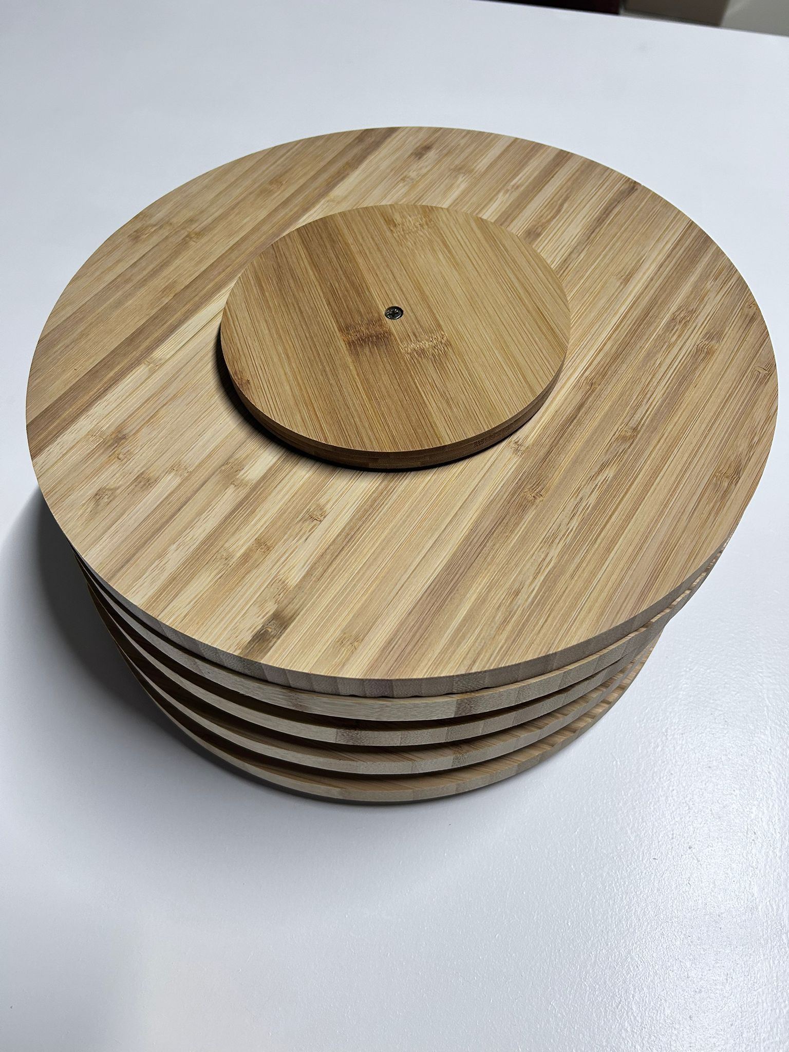 De schaal is gemaakt van bamboe, wat zorgt voor een warme, natuurlijke uitstraling op tafel. De combinatie van bruin bamboe, ronde vorm en draaiplateau maakt deze schaal niet alleen praktisch, maar ook sfeervol. Hij geeft elke tafel direct borrel-energie, zelfs als er “maar even wat snacks” op staan.