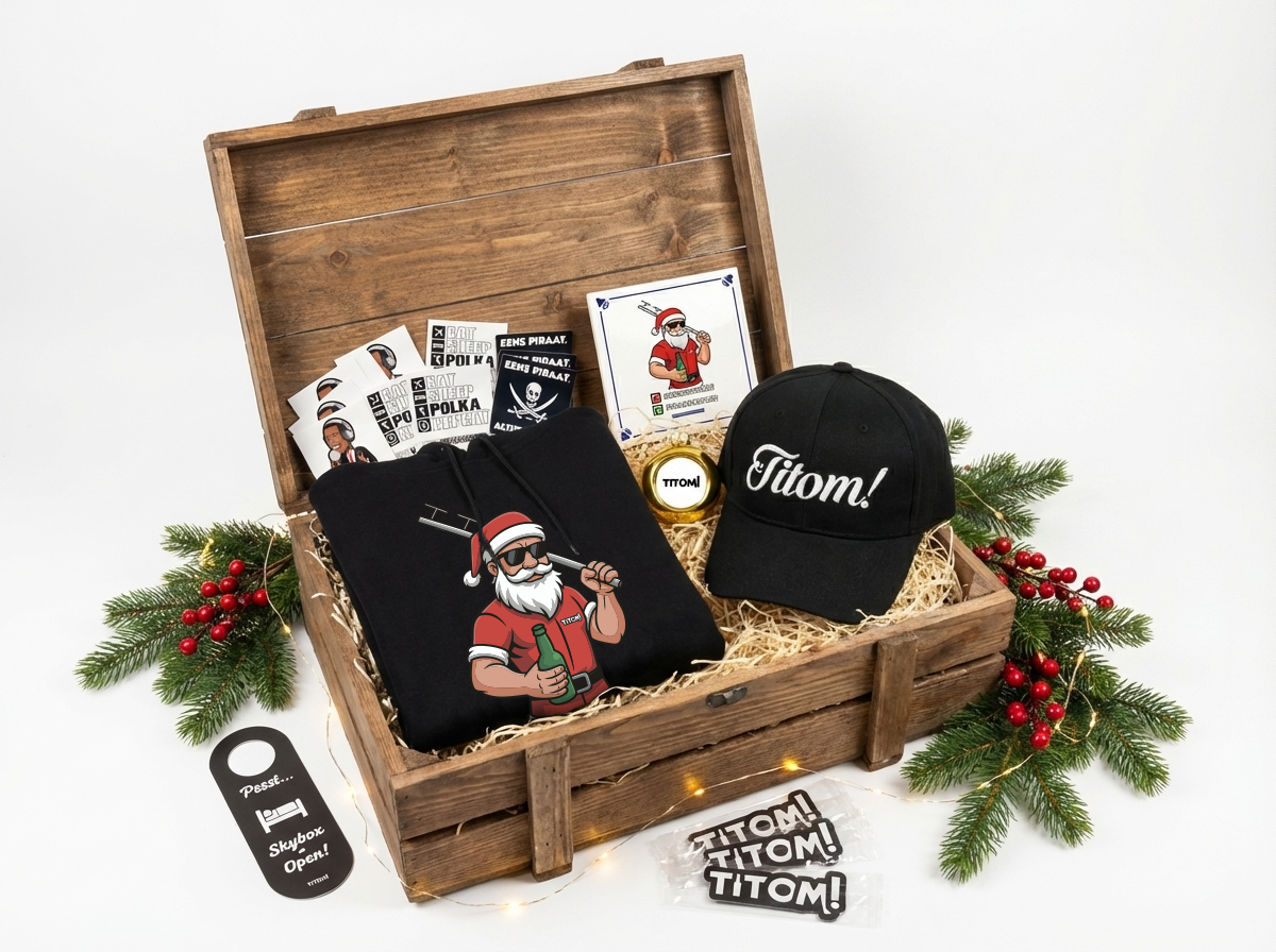 Met de hoodie, kerstbal, tegel, cap, geurhangers, stickers én de Dippie Dippie Deurhanger is dit een pakket dat je niet “even” krijgt – dit is een compleet Titom-pakket.