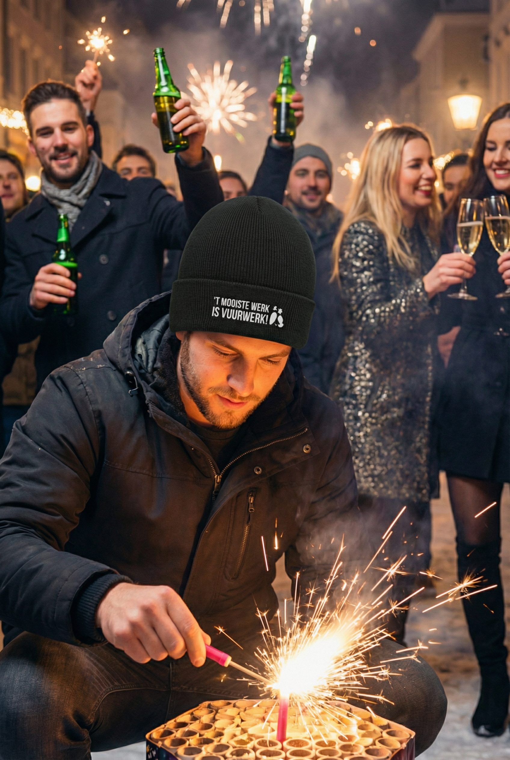 De Muts ’t Mooiste werk is vuurwerk is gemaakt voor iedereen die oud & nieuw niet alleen viert met een groene knuppel en een oliebol, maar met een flinke dosis adrenaline en een oorverdovende knal. Deze muts is speciaal voor de échte vuurwerkliefhebber: warm, stoer en perfect om het jaar af te sluiten zoals het hoort – met vuurwerk.
